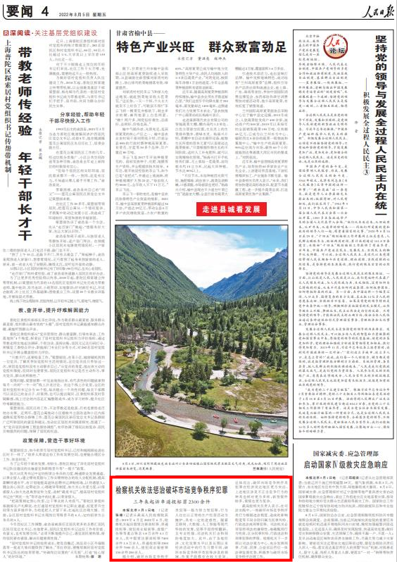 记者从最高人民检察院获悉:2019年6月至2022年6月,检察机关起诉假冒注册商标罪、串通投标罪、侵犯商业秘密罪、虚假广告罪等重点罪名1.8万余件4.1万余人,其中假冒注册商标罪7400余件1.5万余人,串通投标罪2300余件7000余人,侵犯商业秘密罪130余件250余人。