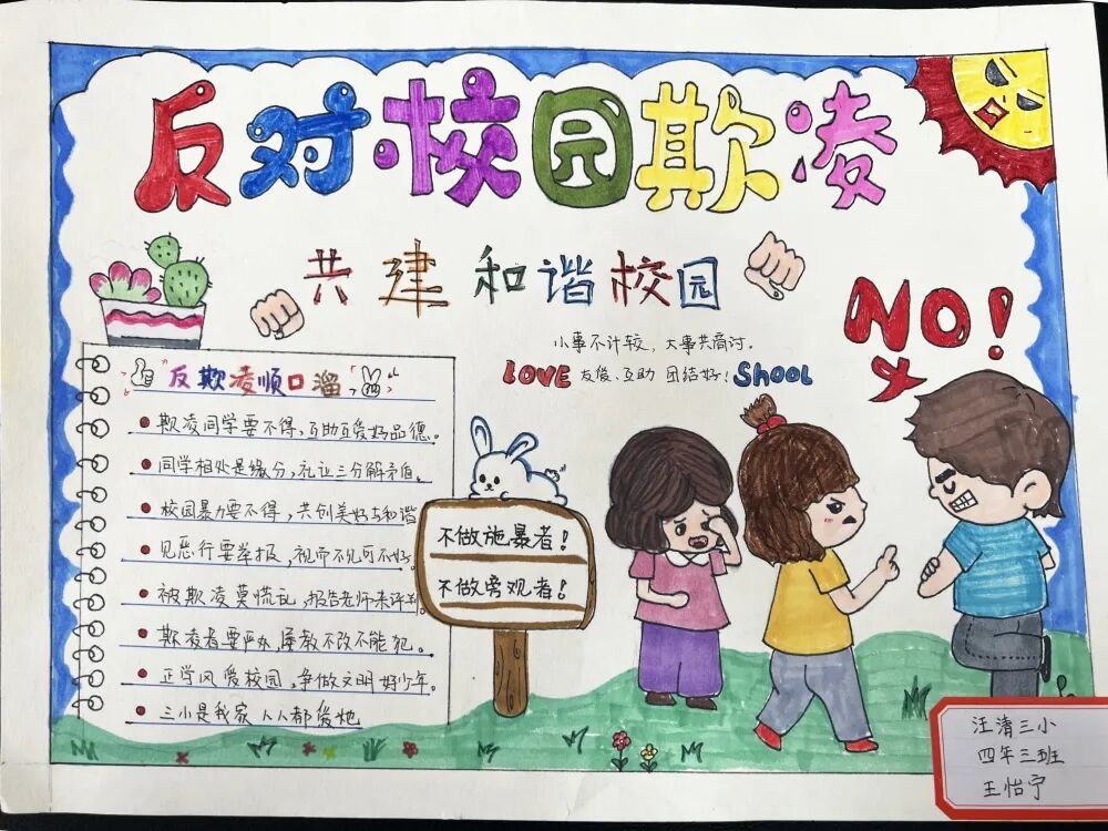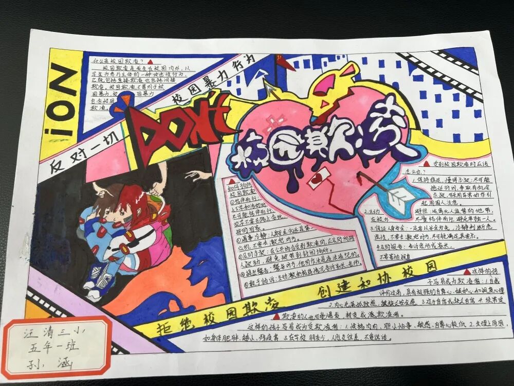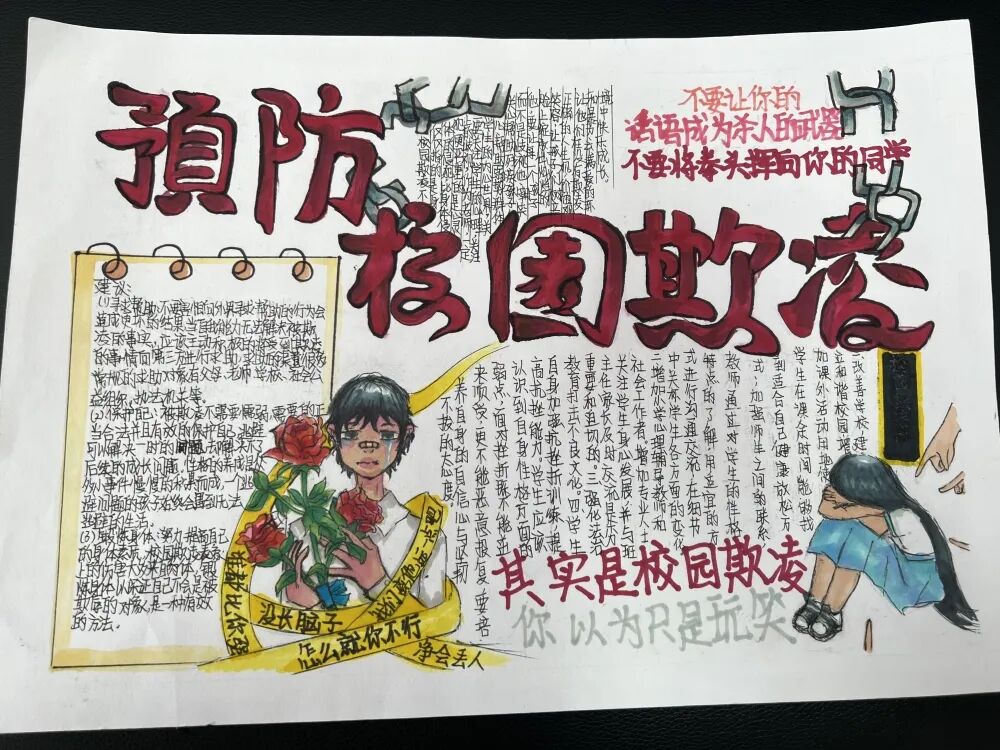 活动得到了全校师生的积极响应,老师们耐心指导,同学们踊跃参与,大胆创意,从报面结构、刊头设计、图案花边、色彩搭配等方面对自己的手抄报作品进行了精心设计,充分展现出同学们对“校园欺凌”的理解和思考。