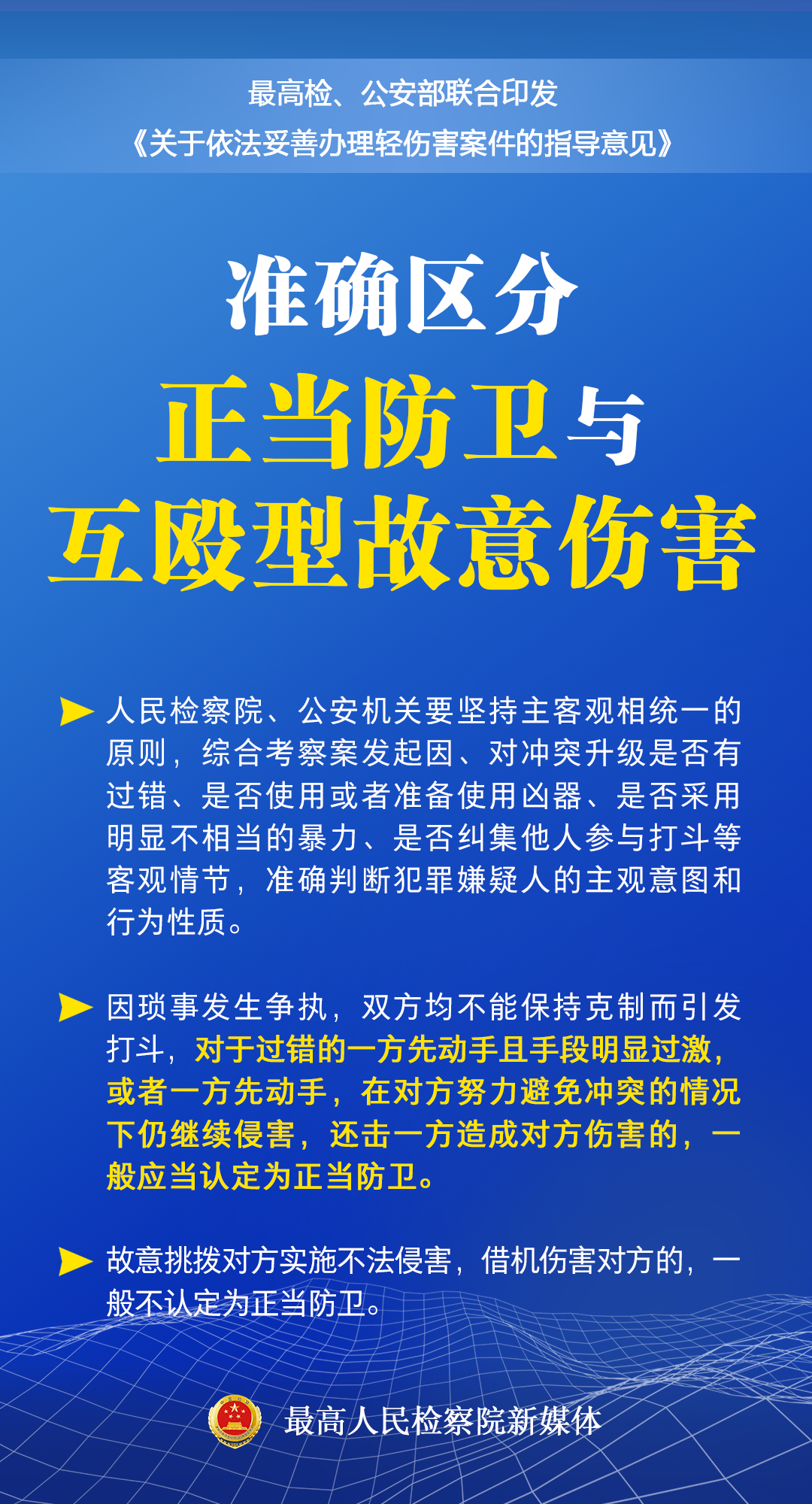 近日,最高检联合公安部印发《关于依法妥善办理轻伤害案件的指导意见》,对司法实践中的突出问题明确了有关意见。如何准确区分正当防卫与互殴型故意伤害?如何准确认定共同犯罪?戳图get!