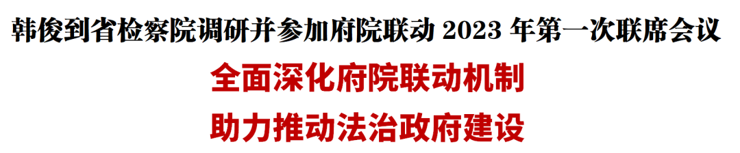 2月20日,省委副书记、省长韩俊到省检察院调研并参加府院联动2023年第一次联席会议。他强调,要深入贯彻习近平法治思想,以服务全面振兴大局为目标,以法治吉林建设为引领,进一步弘扬法治精神、增强法治观念、运用法治方式,全面深化府院联动机制,助力推动法治政府建设,为吉林全面振兴提供有力法治保障。