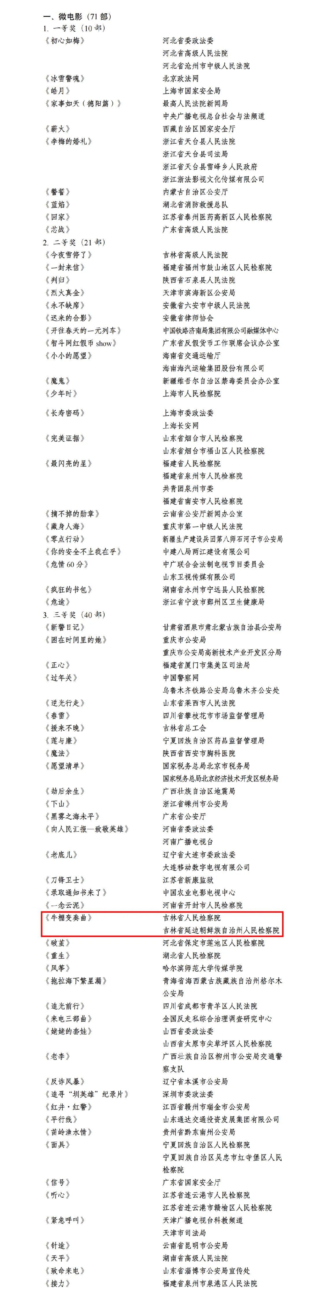 其中,由吉林省检察院与延边州检察院联合拍摄的原创微电影作品《牛棚变奏曲》